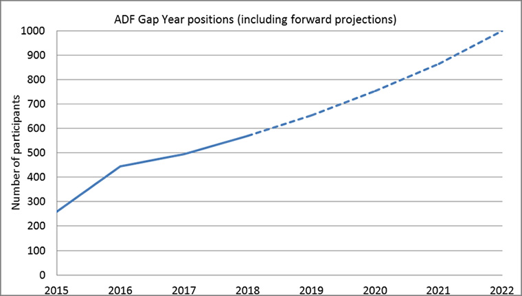 As a regional and global leader Australia plays an important role in the humanitarian response to crises throughout Indo-Pacific Asia and accordingly in conjunction with the Department of Foreign Affairs and Trade and AusAid the development of an Australian Peace Corps targeted at high-school leavers as an alternate national-service option to the existing gap. As the graph below shows if the current 15 per cent growth rate is sustained the program will achieve its original aim of 1000 places a year by 2022. The skills obtained through the ADF Gap Year program will provide valuable work and life experience and are completely transferable.